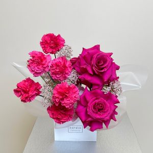 For the bold at heart, the Velvet Magenta offers a striking monochromatic look. This arrangement pairs deep fuchsia roses with ruffled carnations and delicate waxflower accents. It is a testament to our commitment to artistic floral designs and premium quality. Perfect for birthdays, anniversaries, or "just because," this box brings high-end luxury directly to your doorstep with our online flower delivery UAE service. Order through our online flower delivery UAE service with same‑day delivery in Abu Dhabi and next‑day delivery across Dubai, Sharjah, and Al Ain.