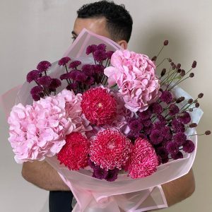 A lavish cascade of pink hydrangeas, deep fuchsia chrysanthemums, and violet button blooms — Amethyst Affair is a celebration of bold femininity and floral artistry. Wrapped in translucent blush paper, this bouquet evokes passion and elegance, perfect for grand gestures, romantic surprises, or luxury gifting. Designed for discerning customers seeking luxury flower arrangements, this piece is available for same-day delivery in Abu Dhabi and next-day across the UAE — including Dubai, Sharjah, and Al Ain. Whether for weddings, events, or home décor, this bouquet is a statement of premium quality and emotional resonance.