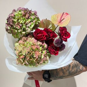 Make a statement with Amour Sauvage, a vibrant bouquet wrapped in white paper and tied with Espoir's signature ribbon. Featuring deep red roses, pink hydrangeas, and exotic anthuriums, this luxury flower arrangement is perfect for celebrations and heartfelt gifting. Enjoy online flower delivery UAE-wide, with same-day delivery in Abu Dhabi and next-day across Dubai, Sharjah, and Al Ain.