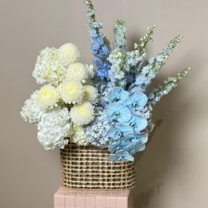 Elevate your space with Azure Lullaby, a premium floral arrangement featuring white chrysanthemums, blue hydrangeas, delphiniums, and orchids. Artistically presented in a woven basket, this design evokes tranquility and sophistication — perfect for weddings, elegant gifts, or refined home decor. Available for online flower delivery UAE-wide, with same-day service in Abu Dhabi and next-day delivery across Dubai, Sharjah, and Al Ain.