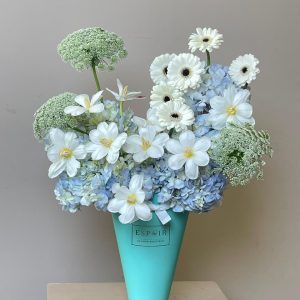 A serene symphony of white tulips, soft gerberas, and pale blue hydrangeas, Azure Meadow evokes purity and grace. Nestled in Espoir's signature cone vase, this arrangement is ideal for weddings, elegant gifting, or refined home decor. Each bloom is hand-selected for freshness and artistic balance—an embodiment of luxury flower arrangements curated for discerning tastes. Available for online flower delivery in UAE with same-day service in Abu Dhabi and next-day across Dubai, Sharjah, and Al Ain.