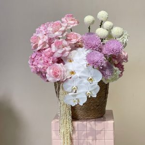A poetic blend of blush roses, pink hydrangeas, white orchids, and lavender chrysanthemums, gracefully arranged in a woven basket. This luxury flower arrangement evokes serenity and sophistication—perfect for weddings, upscale events, or refined home décor. Each bloom is hand-selected for its freshness and beauty, creating a harmonious palette of soft pinks, whites, and purples. Available for same-day delivery in Abu Dhabi and next-day across the UAE, including Dubai, Sharjah, and Al Ain. Experience the art of floral elegance with our online flower delivery UAE service. Buy flowers online and indulge in premium craftsmanship.