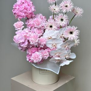 Belle Harmonie is a graceful symphony of soft pink hydrangeas, white orchids, and delicate carnations, elegantly arranged in Espoir's peach box. This luxury flower arrangement radiates charm and refinement — ideal for weddings, upscale events, or thoughtful gifts. Enjoy same-day delivery in Abu Dhabi and next-day across Dubai, Sharjah, and Al Ain. Buy flowers online and elevate every moment.