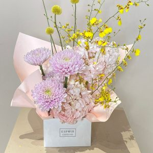 A poetic blend of pale pink hydrangeas, chrysanthemums, Craspedia, and Oncidium orchids — Belle Matinée is a luxury flower arrangement crafted for refined gifting and elegant interiors. Available for same-day delivery in Abu Dhabi and next-day across Dubai, Sharjah, and Al Ain. Buy flowers online in the UAE and experience premium floral artistry.