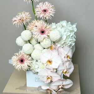 Blossom Épure is a radiant composition of pink gerberas, white hydrangeas, pompom chrysanthemums, and cascading orchids. A luxury flower arrangement that speaks of grace and celebration. Available for same-day delivery in Abu Dhabi and next-day across Dubai, Sharjah, and Al Ain. Buy flowers online in the UAE for unforgettable moments.