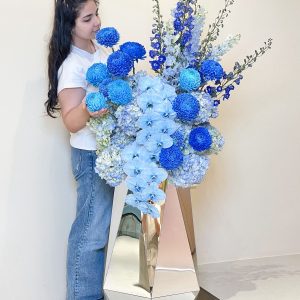 Indulge in the serene beauty of our Blue Mirage Arrangement, a striking composition of layered blue florals designed to evoke calm and quiet elegance. Featuring cascading blue phalaenopsis orchids, lush hydrangeas, sculptural chrysanthemums, and delicate delphinium, this arrangement is artfully composed in a modern mirrored pedestal vase. The tonal palette of sky blue and deep sapphire creates a serene visual rhythm, a statement piece designed for luxury interiors, hotel lobbies, and elegant homes. Each arrangement is handcrafted by the Espoir floral atelier in Abu Dhabi. Enjoy online flower delivery UAE, with same‑day delivery in Abu Dhabi and next‑day across the UAE including Dubai, Sharjah, and Al Ain. Perfect for those who appreciate elegance, craftsmanship, and unforgettable floral design.