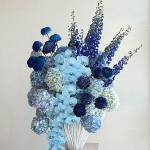 Immerse yourself in the serene beauty of Blue Mirage, a luxury flower arrangement designed to captivate. This premium bouquet features cascading light blue orchids, deep indigo pom-pom blooms, pale lavender hydrangeas, and tall spires of vibrant delphinium. Each stem is hand-selected and artistically arranged in a textured white vase, creating a striking composition that evokes tranquility and sophistication. Perfect for weddings, corporate events, or refined home décor, this bouquet is a statement of elegance and taste. Available for same-day delivery in Abu Dhabi and next-day across the UAE — including Dubai, Sharjah, and Al Ain. Experience the finest in online flower delivery UAE with our bespoke floral artistry.