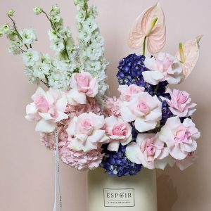 Soft, romantic, and exquisitely detailed — Blush Mirage is a luxurious floral bouquet that blends pale pink roses, lavender and pink hydrangeas, white delphiniums, and blush-toned Anthuriums. Presented in Espoir's signature peach box and finished with a ribbon, this arrangement evokes elegance and grace. Ideal for weddings, bridal showers, or sophisticated gifting, this bouquet is designed for those who appreciate refined floral artistry. With same-day delivery in Abu Dhabi and next-day delivery across Dubai, Sharjah, and Al Ain, it’s the perfect way to celebrate life’s most beautiful moments.