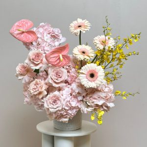 An exquisite mix of pale pink roses, pink hydrangeas, blush gerberas, vibrant yellow oncidium orchids, and pink anthuriums. This bouquet is a radiant expression of joy and elegance—perfect for weddings, grand openings, or luxury gifting.