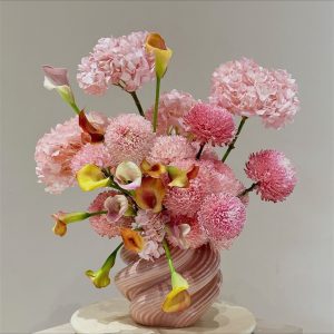 Soft yet striking, Calla Ballet blends pink hydrangeas, delicate chrysanthemums, and calla lilies in sunset hues—nestled in a hand-glazed pink-and-white ceramic vase. This luxury flower arrangement is designed for romantic gestures, bridal tables, or elegant gifting. Crafted for high-end clientele seeking premium floral design with seamless delivery across the UAE.