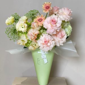 Elevate your gifting experience with Celeste Harmony, a luxurious bouquet featuring pale pink roses, peach gerberas, white lisianthus, and Queen Anne’s lace — all artfully arranged in Espoir's signature cone box. Wrapped in translucent white paper and tied with a satin ribbon, this arrangement embodies elegance and serenity. Ideal for weddings, upscale events, or refined home decor, it’s a statement of taste and sophistication. Enjoy same-day delivery in Abu Dhabi and next-day across the UAE — including Dubai, Sharjah, and Al Ain. Buy flowers online with ease and indulge in premium floral artistry.