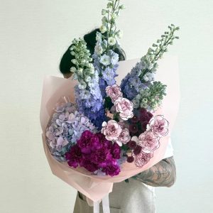 Immerse yourself in the dreamlike beauty of Celeste Reverie, a tall and elegant bouquet featuring blue delphiniums, lavender hydrangeas, magenta and bi-tonal carnations. Wrapped in soft blush paper and tied with a ribbon, this arrangement evokes sophistication and serenity—ideal for weddings, corporate events, or luxury home styling. Crafted by expert florists and designed to impress, Celeste Reverie is available for same-day delivery in Abu Dhabi and next-day delivery across the UAE, including Dubai, Sharjah, and Al Ain. Discover the art of online flower delivery UAE with a bouquet that blends color, texture, and emotion. Buy flowers online and indulge in floral artistry that transcends the ordinary.