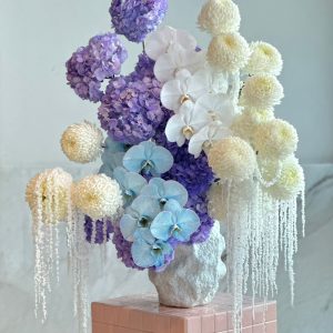 Celestial Cascade is a breathtaking floral sculpture featuring cascading white orchids, pale yellow and ivory chrysanthemums, and hydrangeas in shades of lavender and sky blue. Set in a modern shaped vase, this arrangement blends artistic form with botanical luxury. Perfect for gallery-style home interiors, upscale gifting, or corporate events. Our online flower delivery UAE service ensures freshness and elegance with every order. Available for same-day delivery in Abu Dhabi and next-day across Dubai, Sharjah, and Al Ain. Buy flowers online and elevate your space with timeless beauty.