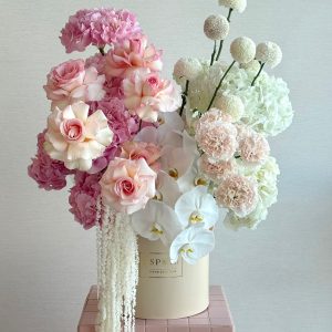 Château Fleur is a dreamlike composition of pink hydrangeas, cream and blush roses, white orchids, and cascading Amaranthus — presented in Espoir's signature peach box. Designed for refined tastes, this bouquet blends texture and tone to create a romantic statement piece. Whether for a bridal suite, anniversary gift, or upscale event, it offers unmatched floral artistry with same-day delivery in Abu Dhabi and next-day across Dubai, Sharjah, and Al Ain.