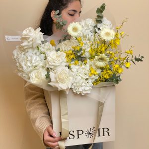 Experience the warmth of a desert sunrise with our Citrine Aura arrangement. This artistic masterpiece blends pristine white Hydrangeas and premium Roses with the vibrant energy of yellow Dancing Lady Orchids and Gerberas. Hand-tied and presented in our signature luxury carry bag, it’s the perfect statement piece for birthdays or home decor. Whether you're looking for online flower delivery in Dubai or a thoughtful gift in Abu Dhabi, this bouquet radiates elegance. Enjoy seamless gifting with online flower delivery UAE, including same‑day delivery in Abu Dhabi and next‑day delivery across Dubai, Sharjah, and Al Ain.
