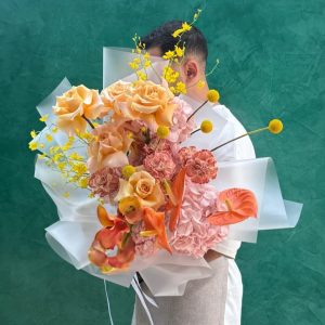 Elevate your floral gifting with Coral Muse, a radiant bouquet featuring peach roses, golden Craspedia, anthuriums, and delicate Oncidium orchids. This luxury flower arrangement is a celebration of warmth and artistry, wrapped in translucent white paper and tied with elegant ribbon. Perfect for weddings, events, or upscale home decor, it’s designed to impress with its vibrant palette and sculptural composition.