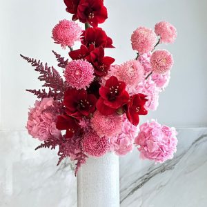 A dramatic interplay of deep red amaryllis, pink pom-pom chrysanthemums and hydrangeas. Crimson Ballet is a sculptural floral arrangement that evokes passion and elegance. Designed in a textured white vase and elevated on a blush pedestal, this piece is ideal for luxury home decor, romantic gifting, or statement event styling. Our premium blooms are hand-selected for their vibrancy and longevity, ensuring a lasting impression. Available for same-day delivery in Abu Dhabi and next-day across the UAE — including Dubai, Sharjah, and Al Ain. Buy flowers online and experience the artistry of floral design.