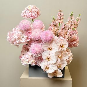 Dewlight Harmony is a poetic blend of blush-toned chrysanthemums, cascading orchids, and delicate hydrangeas—arranged Espoir's signature grey box for dramatic contrast. Designed for high-end gifting and sophisticated interiors, this bouquet celebrates femininity and flair. Experience the finest in luxury flower arrangements with seamless online flower delivery UAE-wide.