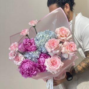 Dreamweaver is a dreamscape of florals — a luxurious bouquet wrapped in translucent pink paper and tied with our signature Espoir ribbon. Featuring pink roses, purple peonies, blue hydrangeas, and soft carnations, this arrangement is designed to enchant. Whether for a romantic gesture, elegant home decor, or a high-end event, this bouquet delivers sophistication and charm. Available for same-day delivery in Abu Dhabi and next-day across Dubai, Sharjah, and Al Ain. Buy flowers online and indulge in premium floral artistry.