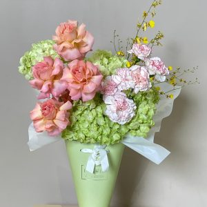 Floraison Vert is a romantic bouquet wrapped in Espoir's signature cone arrangement — a perfect harmony of pink roses, green hydrangeas, white and blush carnations, and cheerful yellow orchids. Designed for gifting, celebration, or personal indulgence, this arrangement reflects the grace and freshness of spring. Enjoy online flower delivery UAE-wide, with same-day service in Abu Dhabi and next-day delivery to Dubai, Sharjah, and Al Ain.