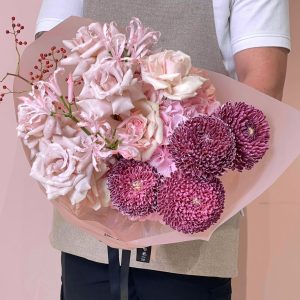 Celebrate life’s special moments with our Floral Caress — a romantic bouquet featuring light pink roses, lush hydrangeas, and deep-hued chrysanthemums, accented with seasonal berries. Wrapped in translucent blush paper and presented by our expert florists, this arrangement is perfect for gifting, anniversaries, or heartfelt gestures. Our luxury flower arrangements are available for same-day delivery in Abu Dhabi and next-day across Dubai, Sharjah, and Al Ain. Buy flowers online and send a message of elegance and affection.