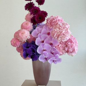 Floral Crescendo is a striking luxury flower arrangement in luxury tall vase, blending deep purple gerberas, lavender orchids, pink hydrangeas, and fluffy chrysanthemums. Designed for visual impact, this gradient composition suits upscale events, hotel lobbies, or statement gifting. Available for online flower delivery UAE-wide, with same-day service in Abu Dhabi and next-day across Dubai, Sharjah, and Al Ain.