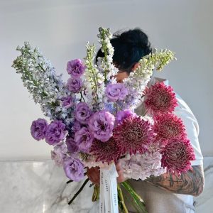 Soft, romantic, and effortlessly chic — Floral Prelude is a handheld bouquet designed for poetic souls and refined tastes. Featuring purple lisianthus, pink chrysanthemums, white and lavender delphiniums, and blush hydrangeas, this luxury flower arrangement is tied with a signature Espoir ribbon and wrapped for elegance. Ideal for weddings, photo shoots, or heartfelt gifting. Enjoy same-day delivery in Abu Dhabi and next-day across Dubai, Sharjah, and Al Ain. Buy flowers online and experience the art of floristry at its finest.