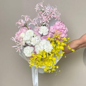 A harmonious blend of soft pink spider lilies, white roses, and vibrant yellow Oncidium orchids, Golden Whisper is a bouquet that speaks in tones of elegance and joy. Wrapped in crisp white paper and tied with a refined ribbon, this luxury flower arrangement is ideal for celebrations, weddings, or upscale gifting. Enjoy seamless online flower delivery in the UAE—same-day in Abu Dhabi and next-day across Dubai, Sharjah, and Al Ain. Buy flowers online and experience the artistry of premium floral design.