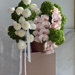 Gracebound blends serene white pom-pom blooms with soft pink orchids and lush green hydrangeas. Designed for heartfelt gifting, condolence gestures, or refined event styling, this luxury flower arrangement is hand-crafted for elegance. Enjoy same-day delivery in Abu Dhabi and next-day across Dubai, Sharjah, and Al Ain. Buy flowers online with confidence and grace.