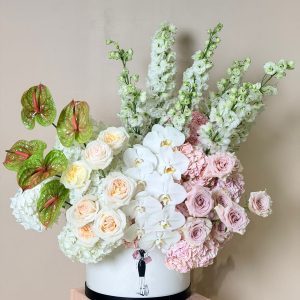 Indulge in the finest expression of floral artistry with this luxury arrangement, blending cascading white phalaenopsis orchids, blush garden roses, hydrangeas, premium delphinium stems, and glossy green anthuriums. Designed for high-end clients who appreciate elegance, balance, and premium-quality blooms, this arrangement transforms any setting into a statement of sophistication. Perfect for weddings, VIP gifting, special celebrations, corporate events, and luxury home décor, this arrangement highlights Espoir’s commitment to exceptional craftsmanship. Order effortlessly through our online flower delivery UAE platform and enjoy same-day delivery in Abu Dhabi and next-day delivery across the UAE — including Dubai, Sharjah, and Al Ain.