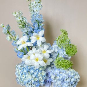 Hydrangea Haze is a luxury flower arrangement crafted for refined tastes. Featuring white tulips, pale blue hydrangeas, tall delphiniums in blue and white, and airy Queen Anne’s lace, this bouquet is a study in texture and tranquility. Presented in a white ceramic vase, it’s perfect for home decor, corporate gifting, or elegant events. Enjoy same-day delivery in Abu Dhabi and next-day across Dubai, Sharjah, and Al Ain. Buy flowers online and bring timeless beauty into your space.