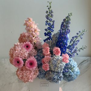 A celebration of grace and serenity. This luxury flower arrangement features pink gerberas, peach and blue hydrangeas, soft carnations, and tall blue delphiniums—elegantly arranged in Espoir's white square box. Perfect for weddings, heartfelt gifting, or enhancing your home with floral artistry, Espoir embodies premium quality and poetic design. Enjoy online flower delivery UAE-wide, with same-day service in Abu Dhabi and next-day delivery to Dubai, Sharjah, and Al Ain. Buy flowers online and indulge in the beauty of bespoke floral craftsmanship.