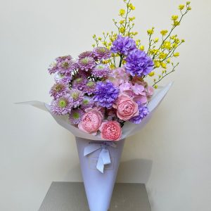 Experience the height of floral artistry with our Lavender Dream. This unique arrangement breaks away from traditional vases, offering a sculptural display of ruffled purple carnations, delicate pink garden roses, and airy yellow oncidium orchids. Perfect for those who appreciate luxury flower arrangements with a modern twist, this bouquet brings a pop of sophisticated color to any space. Whether you are celebrating a milestone or simply brightening a home, our premium blooms are curated to impress. Enjoy seamless online flower delivery UAE, with same‑day delivery in Abu Dhabi and next‑day across Dubai, Sharjah, and Al Ain.