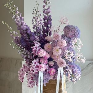 Celebrate grandeur with Lavender Legacy, a tall basket arrangement featuring purple delphiniums, hydrangeas, chrysanthemums, and nerines. This luxury flower arrangement is ideal for statement decor, corporate gifting, or elegant events. Available for online flower delivery UAE-wide, with same-day service in Abu Dhabi and next-day across Dubai, Sharjah, and Al Ain.