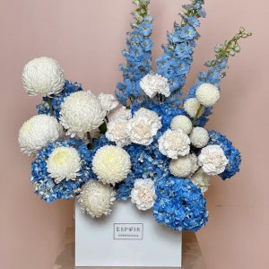 Lumière Bleu is a refined floral composition that blends serenity and sophistication. Nestled in Espoir's signature white box, this arrangement features pale blue hydrangeas, ivory pom-pom blooms, peach carnations, and tall blue delphiniums—creating a graceful vertical silhouette ideal for luxury events and home styling. Perfect for corporate gifting, weddings, or elegant celebrations, this bouquet is available for same-day delivery in Abu Dhabi and next-day delivery across Dubai, Sharjah, and Al Ain. Our online flower delivery UAE service ensures your flowers arrive fresh, artfully arranged, and on time. Experience the artistry of luxury flower arrangements with Lumière Bleu — a timeless gift for those who appreciate beauty in every detail.