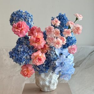 Immerse yourself in the dreamlike beauty of Lumière Bleu, a luxury bouquet featuring blue hydrangeas, pink roses, ruffled carnations, and pale blue orchids. Presented in a textured white vase, this arrangement is a symphony of color and softness — perfect for weddings, gifting, or refined home styling. Crafted for those who appreciate premium floral design and seamless service, this bouquet is available for same-day delivery in Abu Dhabi and next-day across Dubai, Sharjah, and Al Ain. Buy flowers online and indulge in elegance.