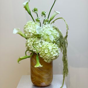 Elevate any space with Lush Serenity, a sculptural design featuring premium green hydrangeas, white calla lilies, and cascading Amaranthus arranged in a marbled amber vase. This luxury flower arrangement is crafted for discerning clients seeking artistic floral designs with a modern, refined aesthetic. Perfect for weddings, corporate events, home décor, and gifting, this piece embodies natural movement and serene beauty. Enjoy seamless convenience with online flower delivery UAE, including same‑day delivery in Abu Dhabi and next‑day across the UAE Dubai, Sharjah, and Al Ain. A sophisticated choice for those who love to buy flowers online with confidence and style.