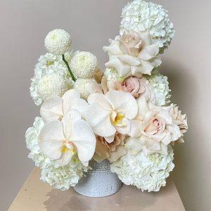 A sculptural arrangement of white orchids, blush roses, hydrangeas, and pompom blooms, Luxe Silence evokes tranquility and timeless elegance. Presented in a textured white vase, this luxury flower arrangement is perfect for refined interiors, corporate events, or heartfelt gifting. Each bloom is selected for its purity and poise, creating a harmonious display that soothes and inspires. Available for same-day delivery in Abu Dhabi and next-day delivery across the UAE, including Dubai, Sharjah, and Al Ain. Experience the finest in online flower delivery UAE with our curated floral artistry.