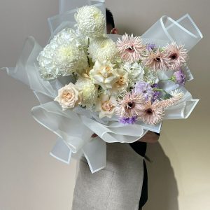 A radiant symphony of white chrysanthemums, pale peach roses, hydrangeas, spider mums, and lisianthus — Maison Tranquille is a luxury flower arrangement designed to captivate. Handcrafted with precision and wrapped in sculptural translucent folds, this bouquet is ideal for weddings, elegant gifting, or refined home decor. Whether you're celebrating a milestone or sending heartfelt wishes, this bouquet speaks in the language of grace. Enjoy same-day delivery in Abu Dhabi and next-day delivery across the UAE, including Dubai, Sharjah, and Al Ain. Discover the art of floral gifting with our premium online flower delivery UAE service