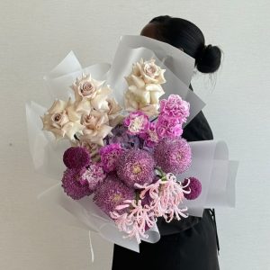 Make a bold impression with our Majestic Petal — a voluminous bouquet of cream and blush roses, vibrant purple chrysanthemums, and layered pink florals. Wrapped in sheer white paper and designed for dramatic elegance, this arrangement suits grand gestures, luxury events, or refined home styling. Each bouquet is handcrafted with premium blooms and delivered with care. Enjoy same-day delivery in Abu Dhabi and next-day service across Dubai, Sharjah, and Al Ain. Buy flowers online and indulge in floral luxury.