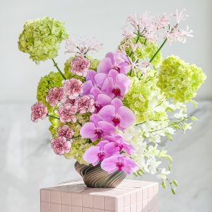 Experience refined floral artistry with Modern Pastel Orchid Arrangement, a sophisticated composition designed for discerning tastes. Featuring cascading premium pink Phalaenopsis orchids, lush green hydrangeas, and delicate blush accents, this luxury flower arrangement brings modern elegance and timeless beauty into any space. Order with confidence from our boutique offering online flower delivery UAE, with same-day delivery in Abu Dhabi and next-day delivery across the UAE — including Dubai, Sharjah, and Al Ain. When you choose to buy flowers online with us, you choose exclusivity, quality, and impeccable service.