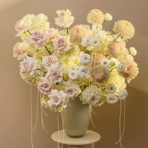 Elevate your space or celebration with Moonlit Botanica — a luxurious floral arrangement designed for refined tastes. This bouquet features pale pink and cream roses, white lisianthus, and soft beige chrysanthemums, artfully composed in a ceramic vase with cascading silk ribbons. Each bloom is hand-selected for its beauty and freshness, creating a poetic harmony of texture and tone. Perfect for weddings, upscale events, heartfelt gifts, or sophisticated home decor, this arrangement embodies timeless grace and artistic craftsmanship. Available for same-day delivery in Abu Dhabi and next-day delivery across the UAE, including Dubai, Sharjah, and Al Ain.