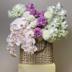 Pastel Rapture is a luxurious basket arrangement featuring cascading pale pink orchids, white and lavender roses, hydrangeas, and chrysanthemums. Designed for high-end interiors, weddings, and thoughtful gifting, this floral piece blends texture and tranquility. Available for online flower delivery UAE-wide, with same-day service in Abu Dhabi and next-day across Dubai, Sharjah, and Al Ain.