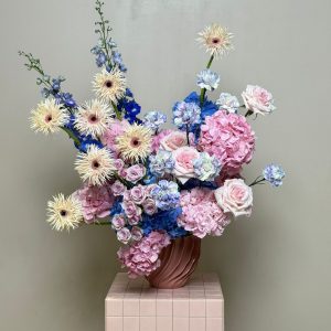 Elevate your space with Pastel Reverie, a luxury flower arrangement featuring pale pink and lavender roses, blue and pink hydrangeas, spider chrysanthemums, and delphiniums. Handcrafted in a sculptural blush vase, this bouquet is a statement of elegance and artistry. Perfect for weddings, events, or refined gifting. Enjoy same-day delivery in Abu Dhabi and next-day across the UAE — including Dubai, Sharjah, and Al Ain. Buy flowers online with confidence and grace.