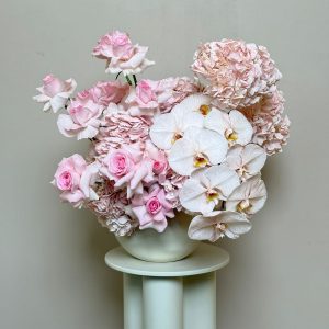 Experience the grace of Experience the grace of Pastel Serenade — a luxury flower arrangement featuring pale pink roses, hydrangeas, carnations, and peach orchids. Nestled in a matte white vase atop a modern pedestal, this bouquet is a refined statement for weddings, home decor, or elegant gifting. Enjoy online flower delivery UAE-wide, with same-day delivery in Abu Dhabi and next-day across Dubai, Sharjah, and Al Ain.
