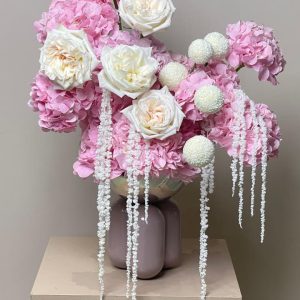 Immerse in the romance of Petal Prelude — a luxury flower arrangement featuring lush pink hydrangeas, creamy peach-centered roses, and cascading white Amaranthus. Set in Espoir's candy vase, this artistic composition evokes timeless elegance. Ideal for weddings, home décor, or upscale gifting. Enjoy same-day delivery in Abu Dhabi and next-day across Dubai, Sharjah, and Al Ain. Buy flowers online for unforgettable moments.