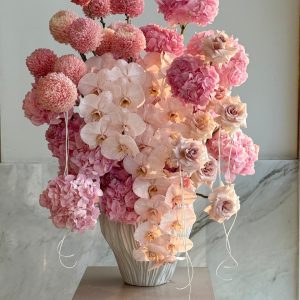 Indulge in the opulence of Primrose Dream — a luxury flower arrangement featuring pom-pom chrysanthemums, hydrangeas, roses, and cascading orchids in soft pink hues. Designed for weddings, events, and upscale gifting, this bouquet embodies refined artistry and premium quality. Available for same-day delivery in Abu Dhabi and next-day across Dubai, Sharjah, and Al Ain. Buy flowers online and elevate your space with timeless floral beauty.