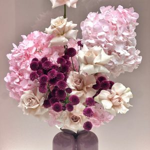 The Rosaline Prestige blends soft pastel roses and hydrangeas with vibrant purple pompom blooms, presented in Espoir's candy vase. This modern luxury arrangement is ideal for stylish homes, corporate spaces, and memorable gifting. Crafted with premium stems and meticulous design, it’s a favorite for customers seeking luxury flower arrangements, online flower delivery UAE, and artistic floral pieces. Enjoy same‑day delivery in Abu Dhabi and next‑day delivery across Dubai, Sharjah, and Al Ain when you buy flowers online from our boutique.