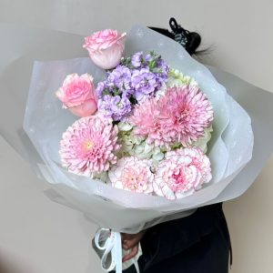 Rosé Mirage is a captivating bouquet that blends light pink roses, chrysanthemums, white hydrangeas, and delicate purple stocks. Wrapped in translucent white and blush-toned paper, this arrangement is held with grace and mystery — a perfect gift for those who appreciate floral artistry. Designed for luxury flower delivery in the UAE, it’s ideal for birthdays, romantic gestures, or stylish home accents. Enjoy same-day delivery in Abu Dhabi and next-day service across Dubai, Sharjah, and Al Ain. Buy flowers online and indulge in the beauty of bespoke floral design.