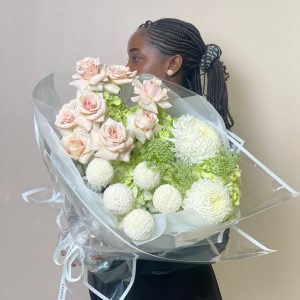 Indulge in the delicate charm of Roseveil, a luxury flower arrangement featuring pale pink roses, mint hydrangeas, white chrysanthemums, and pom-pom blooms wrapped in translucent layers and tied with Espoir ribbon. This bouquet is a poetic gesture for weddings, anniversaries, or heartfelt celebrations. Handcrafted with premium blooms and artistic flair, it’s available for same-day delivery in Abu Dhabi and next-day across Dubai, Sharjah, and Al Ain. Buy flowers online and elevate your gifting experience with our signature floral artistry.